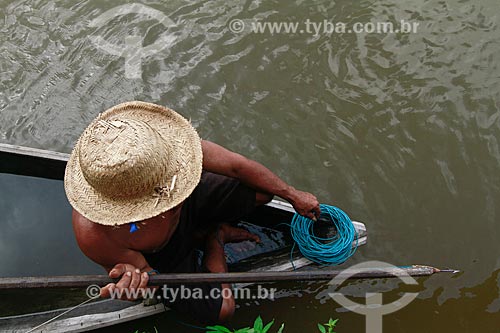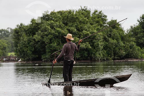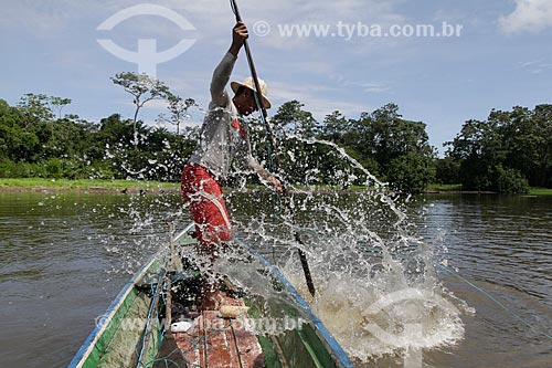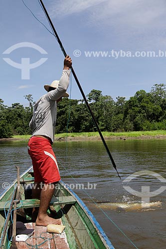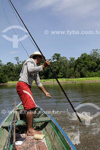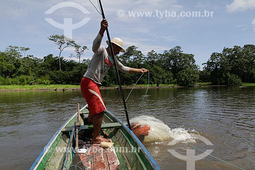 Pescador com arpão e zagaia durante a pesca do Pirarucu (Arapaima gigas) - Reserva de Desenvolvimento Sustentável Piagaçu-Purus - Beruri - Amazonas (AM) - Brasil