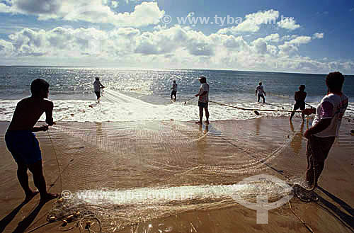 Pescadores com arrastão em Porto Seguro - BA - Brasil A área denominada Costa do Descobrimento (Reserva da Mata Atlântica) é Patrimônio Mundial pela UNESCO desde 01-12-1999 e nela estão localizadas 23 áreas de proteção ambiental na Bahia (incluindo Porto Seguro). - Porto Seguro - Bahia - Brasil