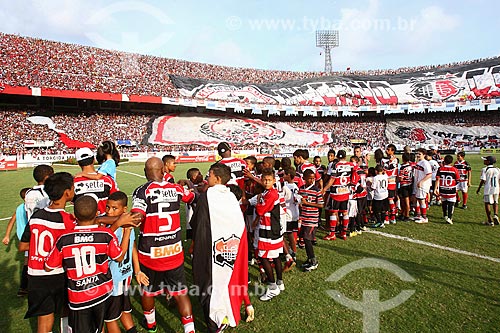 •  Jogadores do Santa Cruz Futebol Clube e crianças entrando em campo no Estádio José do Rego Maciel (1972) - também conhecido como Estádio do Arruda  - Recife - Pernambuco (PE) - Brasil