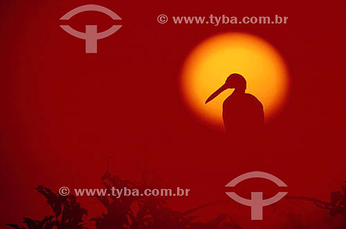 (Mycteria americana) - Silhueta de pássaro Cabeça-Seca, Jabiru ou Passarão - PARNA Pantanal Matogrossense ao pôr-do-so - MT - Brasil A área é Patrimônio Mundial pela UNESCO desde 2000. - Mato Grosso - Brasil