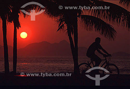 •  Praia de Copacabana ao nascer do sol com silhueta de ciclista entre palmeiras em primero plano - Rio de Janeiro - RJ - Brasil / Data: 06/2001