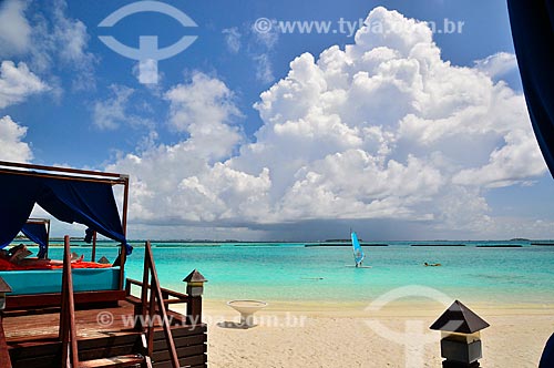 Assunto: Mulher deitada lendo com um windsurf no fundo / Local: Furanafushi - República das Maldivas - Ásia / Data: 04/2010