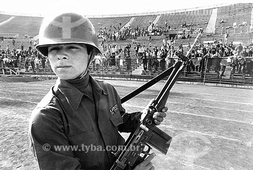 Soldado vigiando presos no Estádio Nacional Julio Martínez Prádanos - mais conhecido com Estádio Nacional - durante o Regime Militar de Augusto Pinochet - Santiago - Província de Santiago - Chile