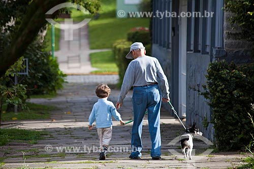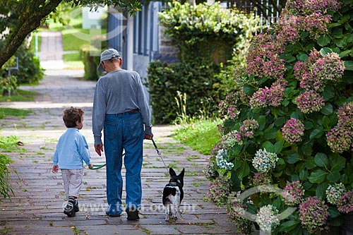 Assunto: Idoso passeando com criança e cachorro / Local: Canela - Rio Grande do Sul (RS) - Brasil / Data: 03/2011