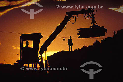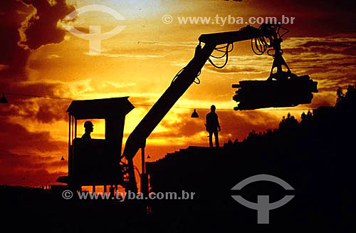 •  Indústria de papel - Silhueta de trabalhadores e empilhadeira mecânica transportando toras de madeira
