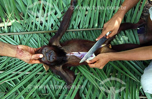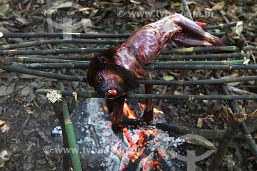 Detalhe de bugio (Alouatta caraya) - também conhecido como bugio-do-pantanal ou guariba - sendo cozido por por caçadores ribeirinhos próximo à rodovia BR-174 - Amazonas (AM) - Brasil