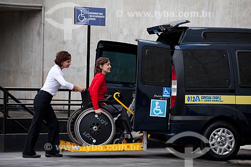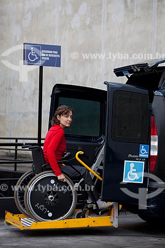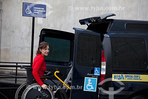 •  Assunto: Mulher cadeirante entrando em taxi adaptado para deficientes físicos, equipado com elevador para transportar cadeira de rodas, em frente ao Museu de Arte Moderna - MAM  / Local:  Rio de Janeiro - RJ - Brasil  / Data: 12/06/2010