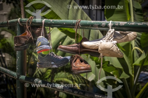 • Sapatos velhos amarrados por barbante em grade - Morro da Babilônia - Rio de Janeiro - Rio de Janeiro (RJ) - Brasil