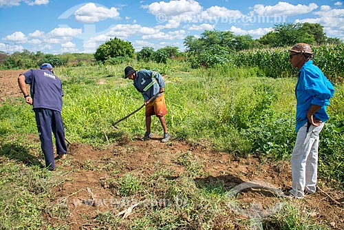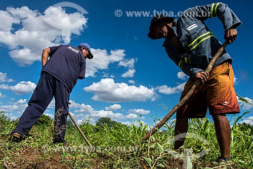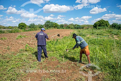 •  Trabalhadores rurais capinando área para fazer roça irrigada com água captada do Rio São Francisco  - Custódia - Pernambuco (PE) - Brasil
