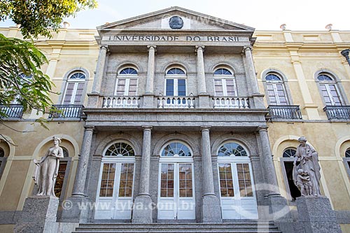 Fachada do prédio do Campus Praia Vermelha da Universidade Federal do Rio de Janeiro - antiga Universidade do Brasil - com a Estátua da Ciência - à esquerda - e a Estátua da Caridade - à direita - Rio de Janeiro - Rio de Janeiro (RJ) - Brasil