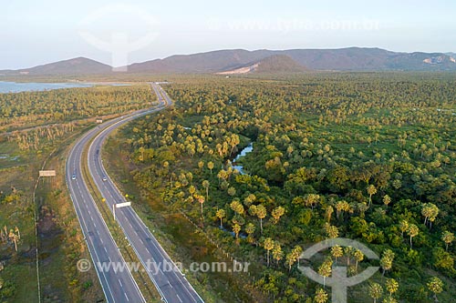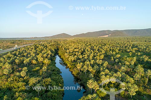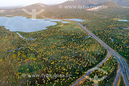 •  Foto feita com drone de trecho da Rodovia CE-065 e plantação de Carnaúba (Copernicia prunifera) com a Lagoa do Cauípe ao fundo  - Caucaia - Ceará (CE) - Brasil