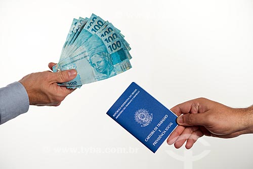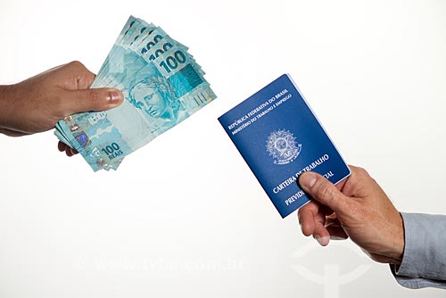 •  Detalhe de mão segurando notas de 100 reais - à esquerda - e mão segurando carteira de trabalho - à direita  - Rio de Janeiro - Rio de Janeiro (RJ) - Brasil