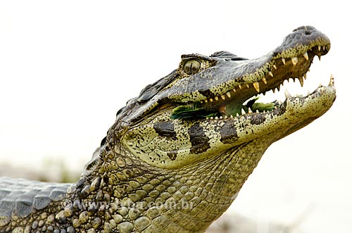 Jacaré-do-pantanal (caiman crocodilus yacare) - também conhecido como Jacaré-do-paraguai - comendo uma Caturrita (Myiopsitta monachus) - também conhecida como Catorra ou Cocota - no Estrada Parque Pantanal - Corumbá - Mato Grosso do Sul - Brasil