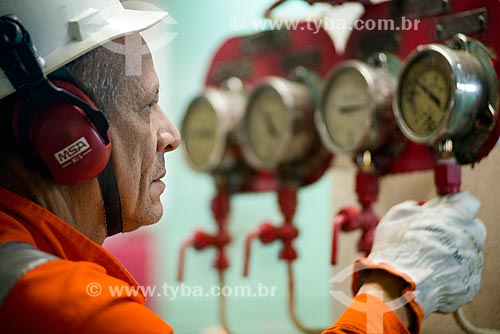 •  Chefe de máquinas Antônio Simões Rolo, na praça de máquinas do navio Maisa  - Rio Grande do Sul (RS) - Brasil