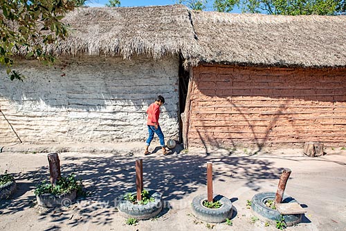 •  Menino indígena jogando futebol próximo à casa de pau-a-pique com cobertura de sapé na Aldeia Mata Verde Bonita (Tekoa Ka Aguy Ovy Porã) da Tribo Guarani  - Maricá - Rio de Janeiro (RJ) - Brasil