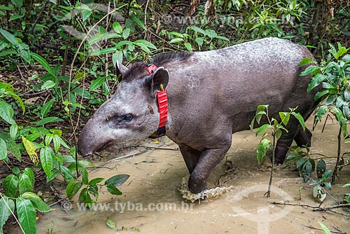 •  Detalhe de anta (Tapirus terrestris) com colarinho GPS de rastreamento vermelho na Reserva Ecológica de Guapiaçu  - Cachoeiras de Macacu - Rio de Janeiro (RJ) - Brasil