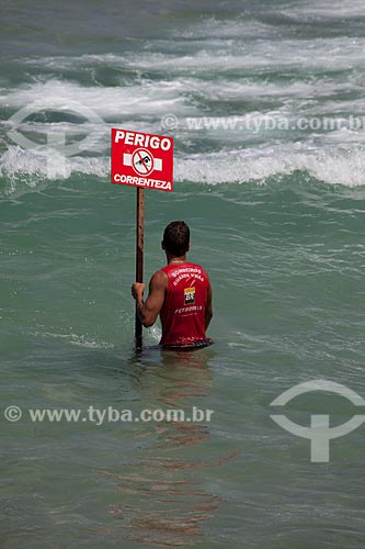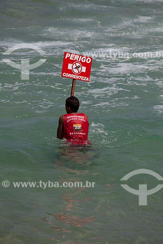 Assunto: Bombeiro guarda vidas colocando placa de Perigo correnteza na Praia de Ipanema / Local: Ipanema - Rio de Janeiro (RJ) - Brasil / Data: 04/2012