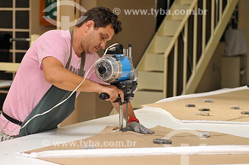 Cortador com máquina de corte de tecido trabalhando na produção de roupas - Ibirá - São Paulo - Brasil