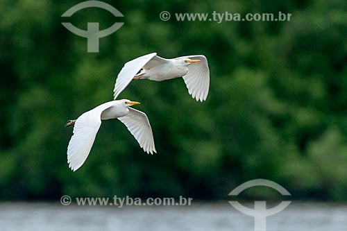 • Grupo de Garças-vaqueiras (Bubulcus ibis) voando na Reserva Ecológica de Guapiaçu - Cachoeiras de Macacu - Rio de Janeiro (RJ) - Brasil