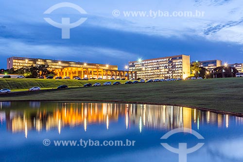 Vista do Palácio do Itamaraty - à esquerda - com a Esplanada dos Ministérios durante o anoitecer - Brasília - Distrito Federal (DF) - Brasil