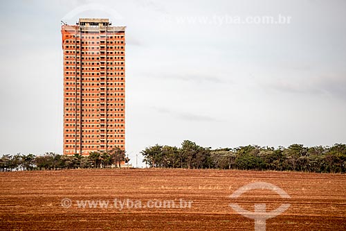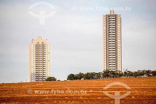 Foto feita com drone de canavial próximo ao Parque Olhos DÁgua com condomínio residencial ao fundo - Ribeirão Preto - São Paulo (SP) - Brasil