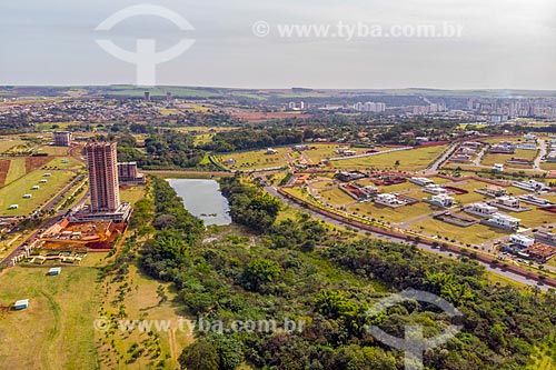 Foto feita com drone do Parque Olhos DÁgua - à esquerda - com condomínio residencial - Ribeirão Preto - São Paulo (SP) - Brasil