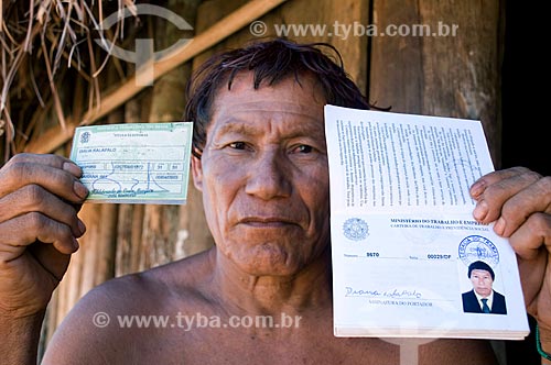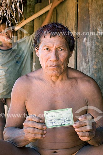 Índio Dyaua Kalapalo com título de eleitor e carteira profissional - Aldeia Aiha Kalapalo - Querência - Mato Grosso - Brasil