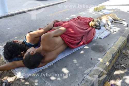 • Casal de sem teto e animal de estimação dormindo em colchão na calçada - Fortaleza - Ceará (CE) - Brasil