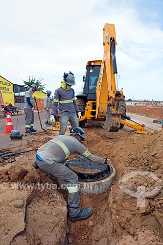 •  Funcionários da Companhia Estadual de Águas e Esgotos (CEDAE) fazendo o reparo na tubulação de esgoto por entupimento de gordura na esquina da Rua Rua Alberto Santos Dumont com a Rua Álvares de Castro  - Maricá - Rio de Janeiro (RJ) - Brasil