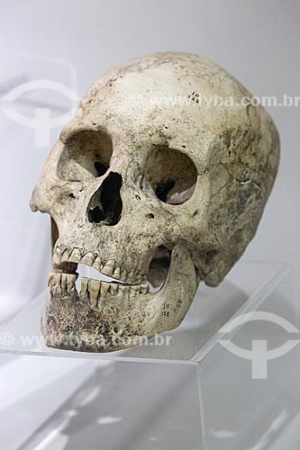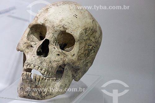 Crânio de Homo sapiens em exibição no Museu Nacional - antigo Paço de São Cristóvão - Rio de Janeiro - Rio de Janeiro (RJ) - Brasil