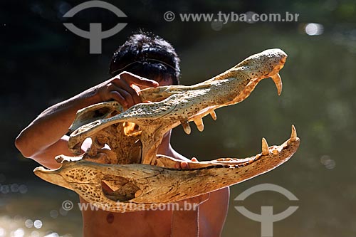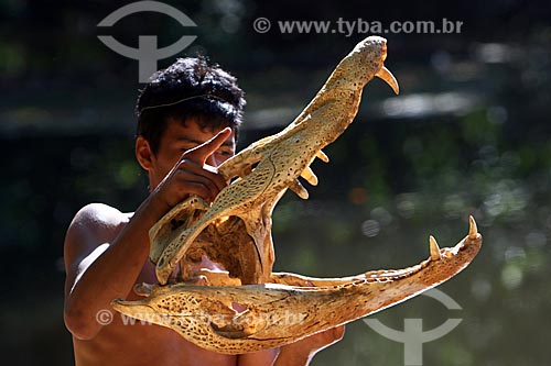 •  Ribeirinho segurando o esqueleto do crânio de um jacaré-açu (Melanosuchus niger)  - Amazonas (AM) - Brasil