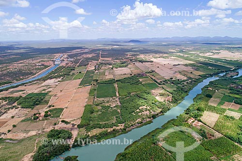 Foto feita com drone do canal do Projeto de Integração do Rio São Francisco - eixo norte - próximo à Estação de Bombeamento EBI 2 com o Reservatório Terra Nova ao fundo - Salgueiro - Pernambuco (PE) - Brasil