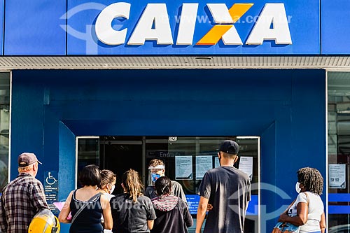 • Fila de pessoas diante de agência da Caixa Econômica Federal em busca de informações sobre o auxí­lio emergencial durante a pandemia - Crise do Coronavírus - Caraguatatuba - São Paulo (SP) - Brasil