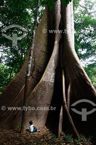 Assunto: Criança observa arvore Samaúma (Ceiba pentandra) localizada na beira do Rio Ariaú / Local: Amazonas (AM) - Brasil / Data: 09/2013