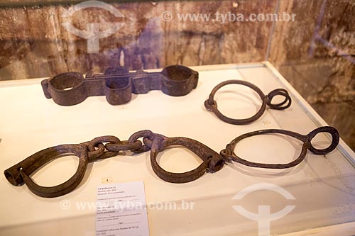 Detalhe de instrumentos de tortura (de cima para baixo) vira-mundo (século 19) e peia (século 18) com gargalheira (século 19) à direita em exibição no Museu das Bandeiras (1766) - antiga Cadeia e Câmara Municipal - Goiás - Goiás (GO) - Brasil