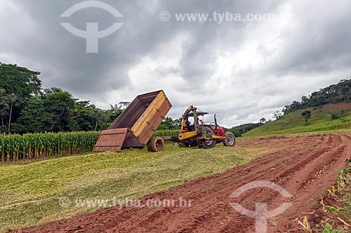 Descarregamento de milho transgênico triturado - para silagem e alimentação de gado - na zona rural da cidade de Guarani - Guarani - Minas Gerais (MG) - Brasil