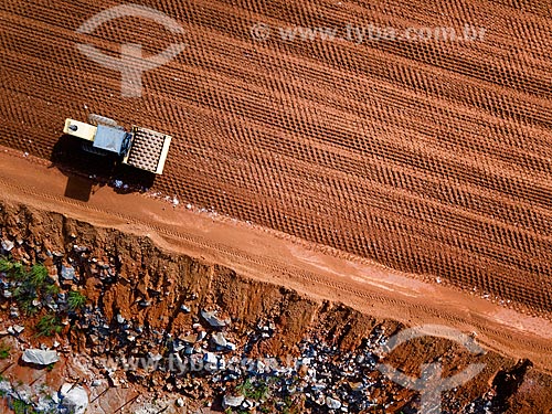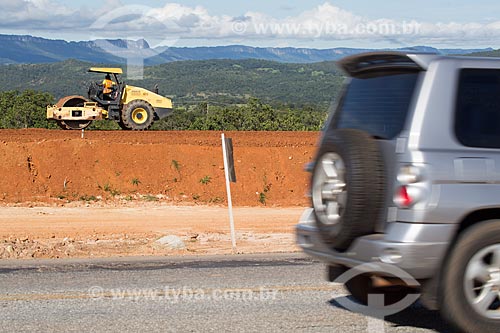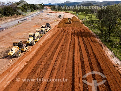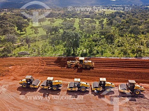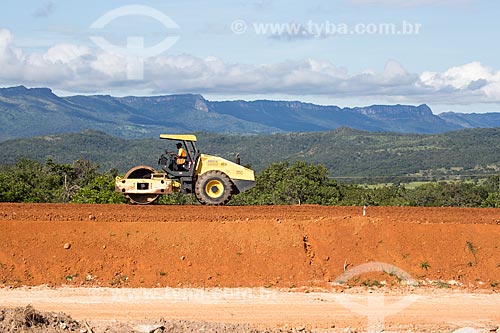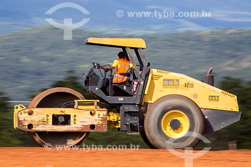 •  Detalhe de rolo compactador durante a terraplanagem para duplicação da Rodovia Jayme Câmara (GO-070) próximo à cidade de Goiás  - Goiás - Goiás (GO) - Brasil