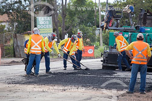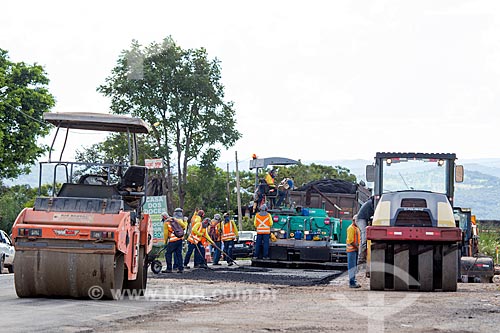 Operários aplicando asfalto no Km 5 da Rodovia Jayme Câmara (GO-070) próximo à cidade de Goiás - Goiás - Goiás (GO) - Brasil