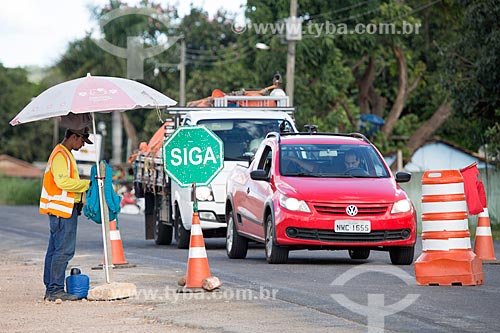 Interdição para aplicação de asfalto no Km 5 da Rodovia Jayme Câmara (GO-070) próximo à cidade de Goiás - Goiás - Goiás (GO) - Brasil