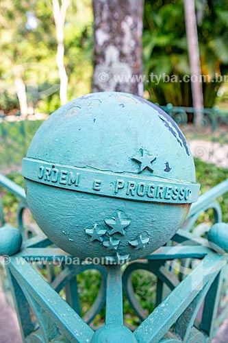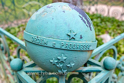 •  Detalhe de representação do globo azul da bandeira nacional com os dizeres: Ordem e Progresso em cerca do Jardim Botânico do Rio de Janeiro  - Rio de Janeiro - Rio de Janeiro (RJ) - Brasil