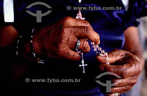 •  Detalhe de mão com terço e crucifixo, em missa noturna na cidade de Bom Jesus da Lapa, uma manifestação importante da fé católica no Brasil - Bahia  - Bom Jesus da Lapa - Bahia - Brasil