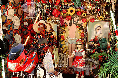 •  Senhora posando em um cenário montado para tirar fotografias em festa religiosa -  Bom Jesus da Lapa - BA - Brasil  - Bom Jesus da Lapa - Bahia - Brasil