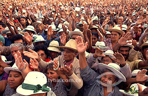 •  Romeiros tirando o chapéu na missa noturna (Esplanada II) em Bom Jesus da Lapa, uma manifestação importante da fé católica no Brasil - sertão da Bahia  - Bom Jesus da Lapa - Bahia - Brasil