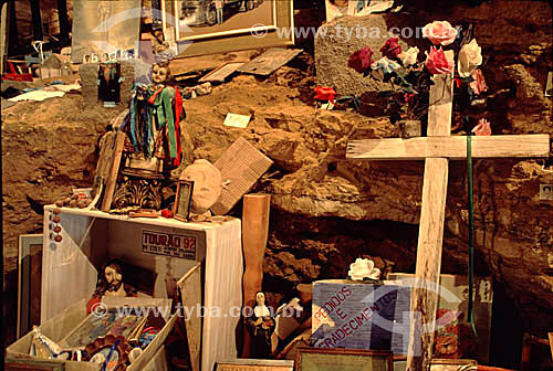 •  Crucifixo de madeira e imagem de santos em sala dedicada aos ex-votos no interior da gruta do Santuário de Bom Jesus da Lapa, uma manifestação importante da fé católica - Bom Jesus da Lapa - Bahia - Brasil  - Bom Jesus da Lapa - Bahia - Brasil