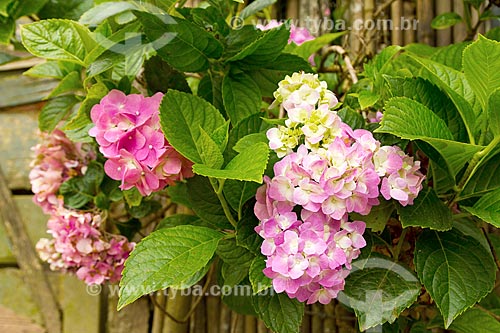 Detalhe de hortênsias (Hydrangea macrophylla) em jardim - Guarani - Minas Gerais (MG) - Brasil