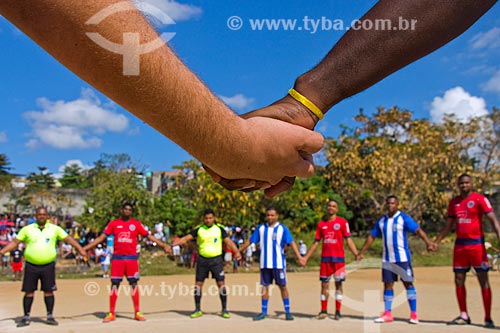 Jogadores dos times de futebol de várzea Toque de Bola x Azul rezando antes do jogo final da 3º Copa Jacarezinho - realização ex-jogador Júnior - no Campo do GE - Favela do Jacarezinho - Rio de Janeiro - Rio de Janeiro (RJ) - Brasil
