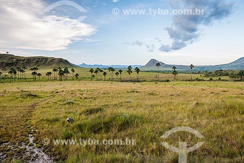 •  Vista de buritis (Mauritia flexuosa) no Jardim de Maytrea com o Morro do Buracão ao fundo  - Alto Paraíso de Goiás - Goiás (GO) - Brasil