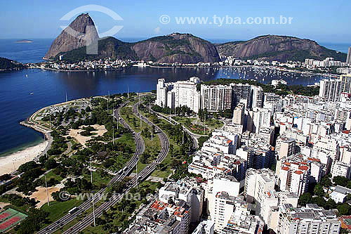 Vista aérea do Aterro do Flamengo (1) com Morro da Viúva, Pão de Açúcar (2) ao fundo - Rio de Janeiro - 14/07/2005 (1) Mais conhecido como Aterro do Flamengo, o Parque Brigadeiro Eduardo Gomes é a mais extensa área de lazer da cidade. Construído sobre aterramento de 1,2 milhão de metros quadrados tomados ao mar, abrange uma faixa de terra que se estende do Aeroporto Santos Dumont até o Morro da Viúva, em Botafogo. O projeto, inaugurado em 1964, foi coordenado por Maria Carlota (Lota) Macedo Soares e os projetos arquitetônico e paisagístico são respectivamente de Affonso Eduardo Reidy e Burle Marx. É Patrimônio Histórico Nacional desde 28-07-1965. (2) É comum chamarmos de Pão de Açúcar, o conjunto da formação rochosa que inclui o Morro da Urca e o próprio Morro do Pão de Açúcar (o mais alto dos dois). Esse conjunto rochoso é Patrimônio Histórico Nacional desde 08-08-1973. - Rio de Janeiro - Rio de Janeiro - Brasil