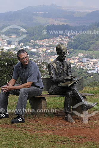 •  Assunto: Fotógrafo Rogério Reis junto à estátua no Memorial Carlos Drummond de Andrade com a cidade ao fundo / Local: Itabira - Minas Gerais - Brasil / Data: 25/04/2009