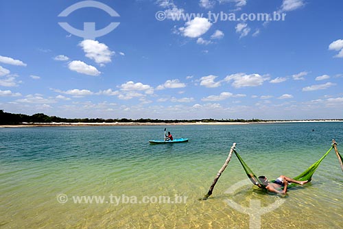 Praticante de stand up paddle e banhistas na Lagoa do Iriri - também conhecida como Lagoa da Coca-Cola - Rio das Ostras - Rio de Janeiro (RJ) - Brasil